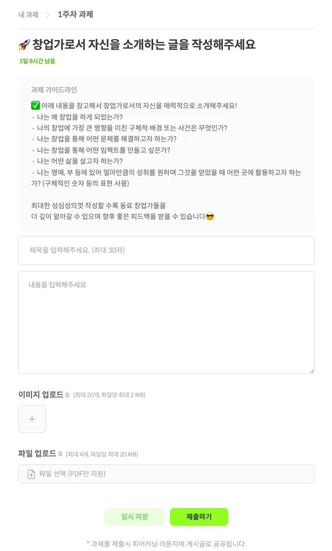 매주 제공되는 과제는 각 프로그램의 목표 달성을 위해 단계별로 쪼개어 제공됩니다. 과제를 시작하면 각 주차별 과제 가이드라인이 제공되는데, 해당 가이드라인에 맞게 과제를 수행하시면 완성도 높은 결과물을 만드실 수 있습니다!