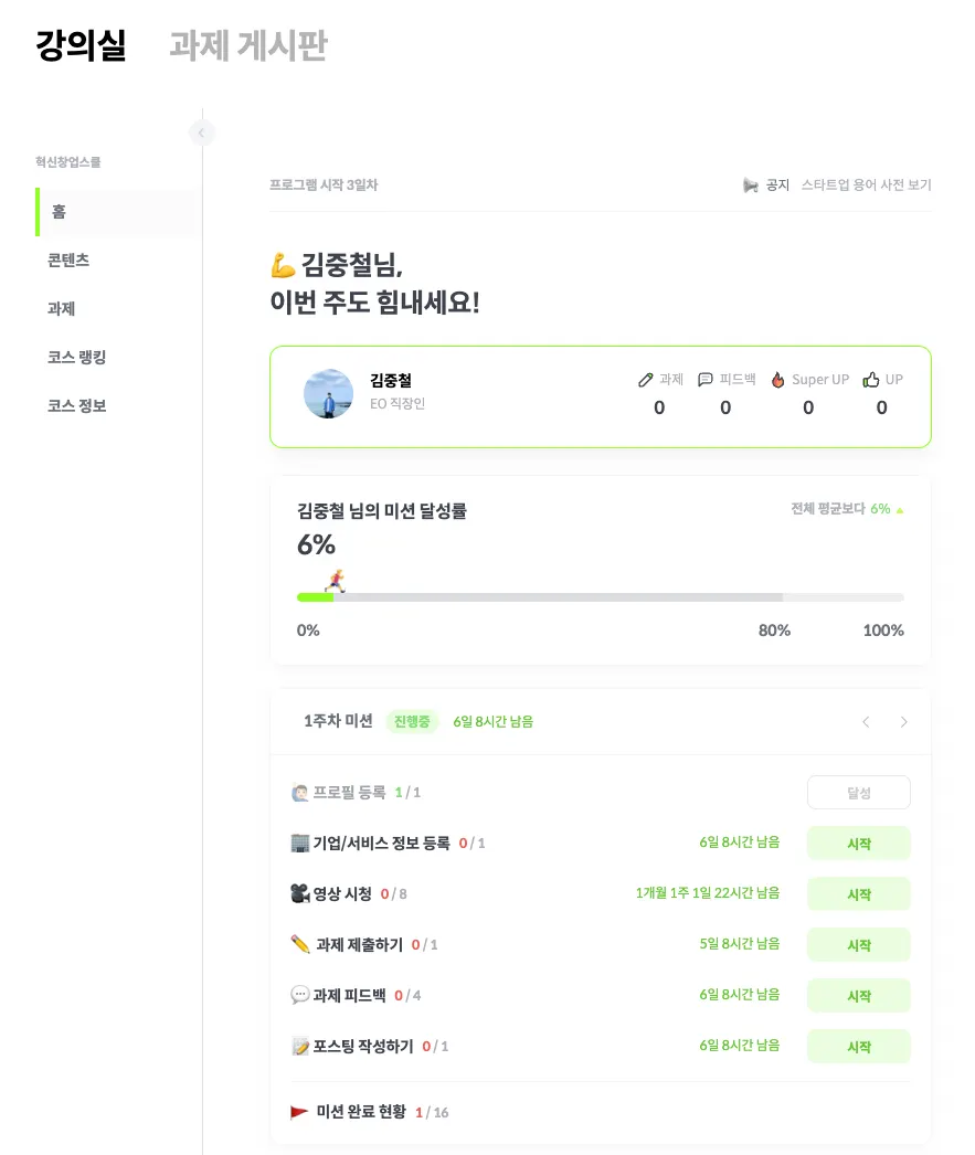 [입장하기]를 클릭하시면 가장 먼저 강의실 홈 메뉴에 입장하게 되는데요, 매 주차마다 미션 현황을 볼 수 있는 대시보드가 제공되고, 각 미션을 수행하실 때 마다 미션 달성률이 올라가게 됩니다.