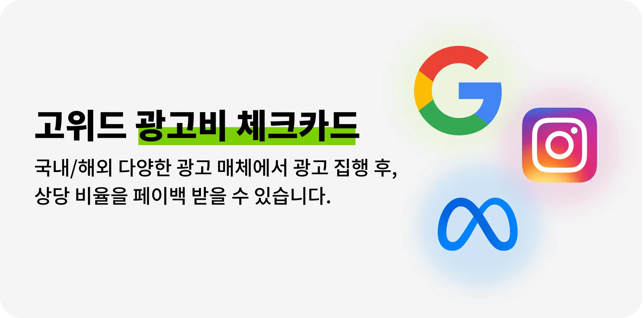 광고비, 비즈니스의 성장을 위한 필수 지출입니다. 매월 광고비 지출액의 상당 비율을 페이백 받을 수 있는, [고위드 광고비 체크카드]를 소개합니다.