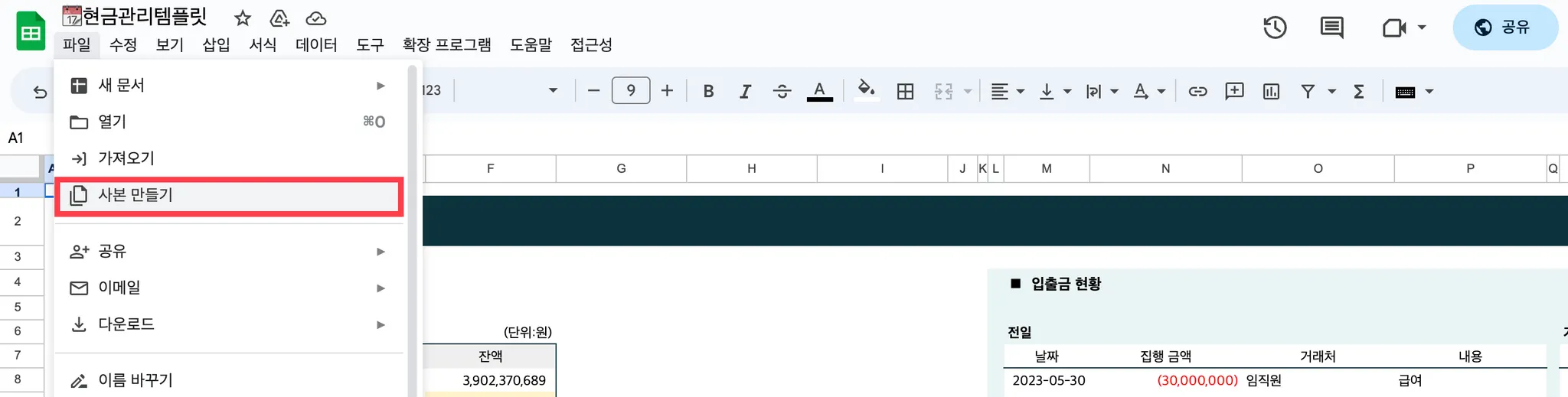 [구글 스프레드시트 좌측 상단] → [파일-사본 만들기]를 클릭하여 사용하시면 됩니다.