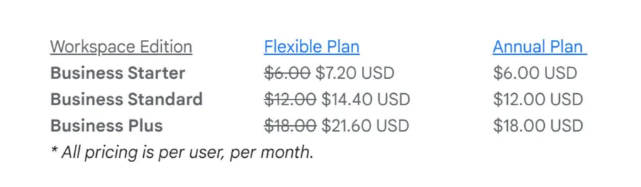구글 워크스페이스 요금제는 일반적으로 사용자 당 월별 구독 요금으로 책정되기 때문에 조직 내 사용자의 수에 따라 달라집니다. 또한, 대량 구매에 대한 구글 워크스페이스 가격 할인 혜택이 제공됩니다. 일반적인 구글 워크스페이스 요금제는 아래와 같습니다.